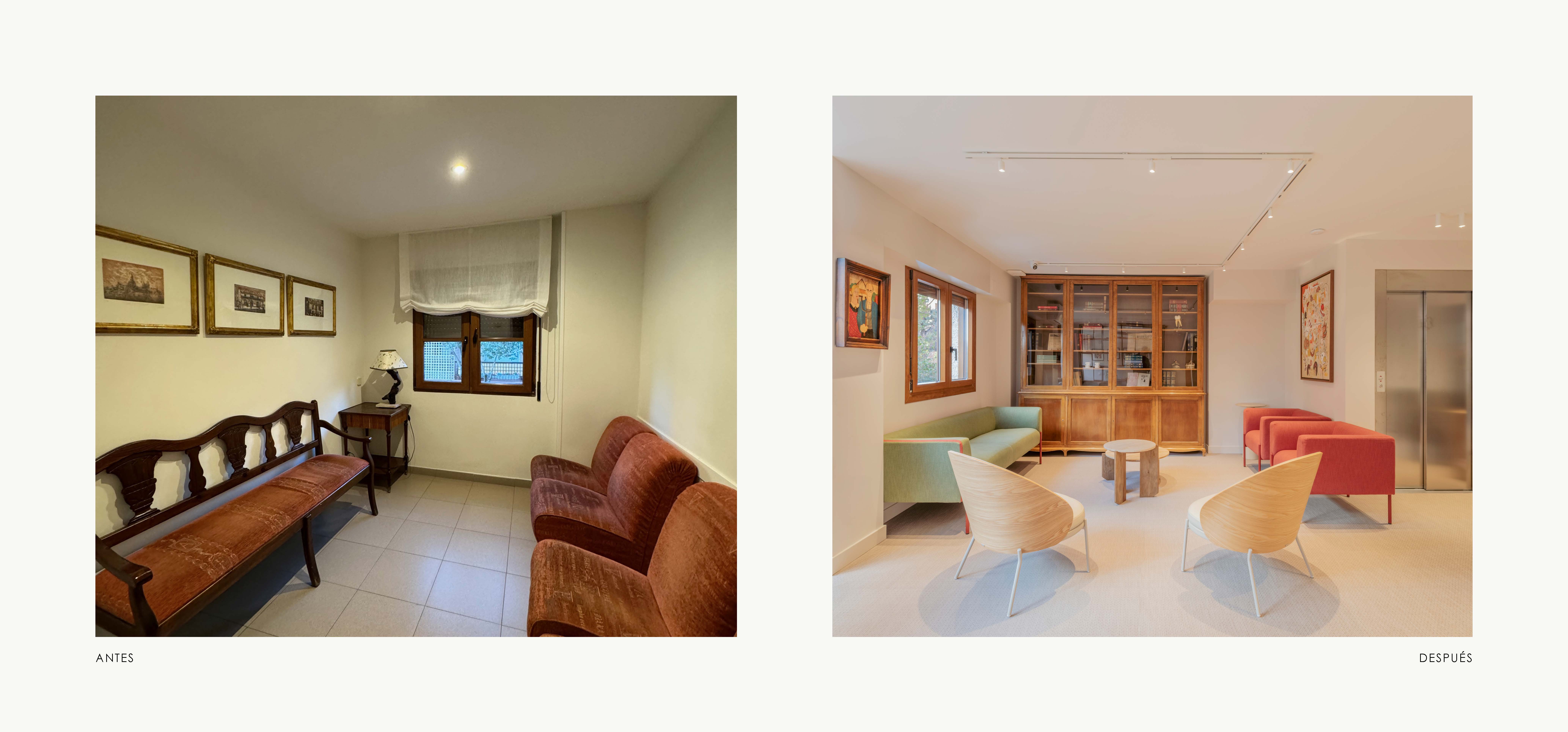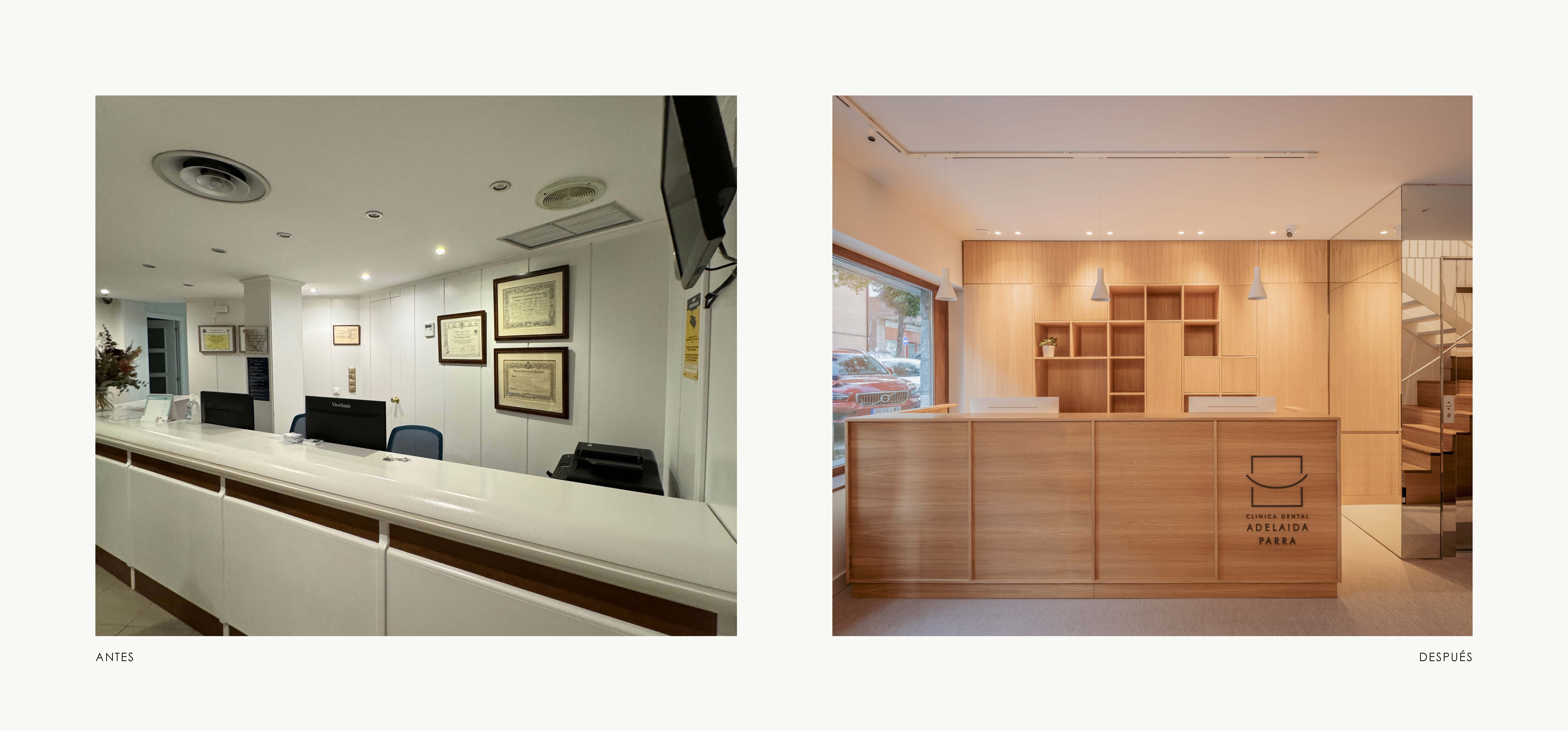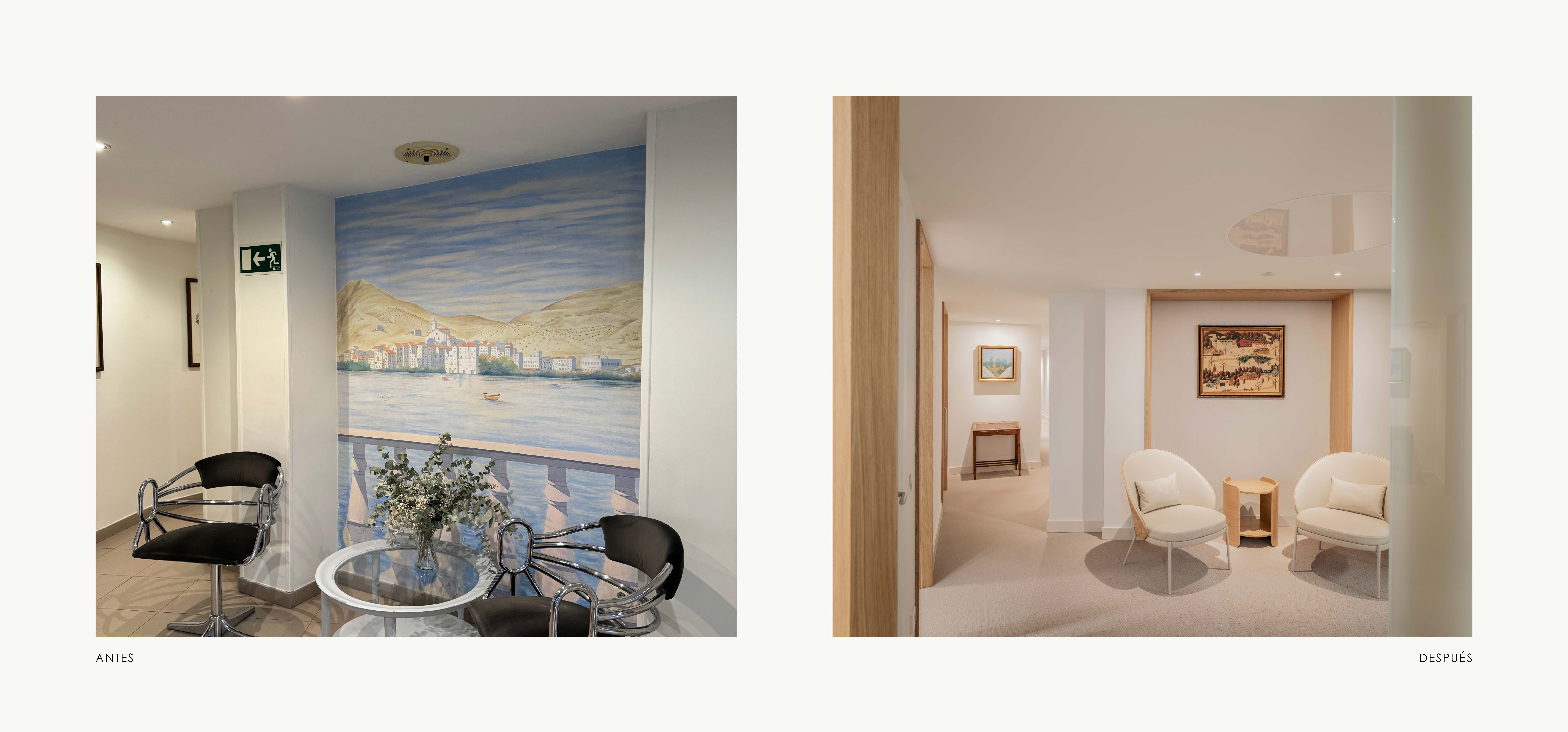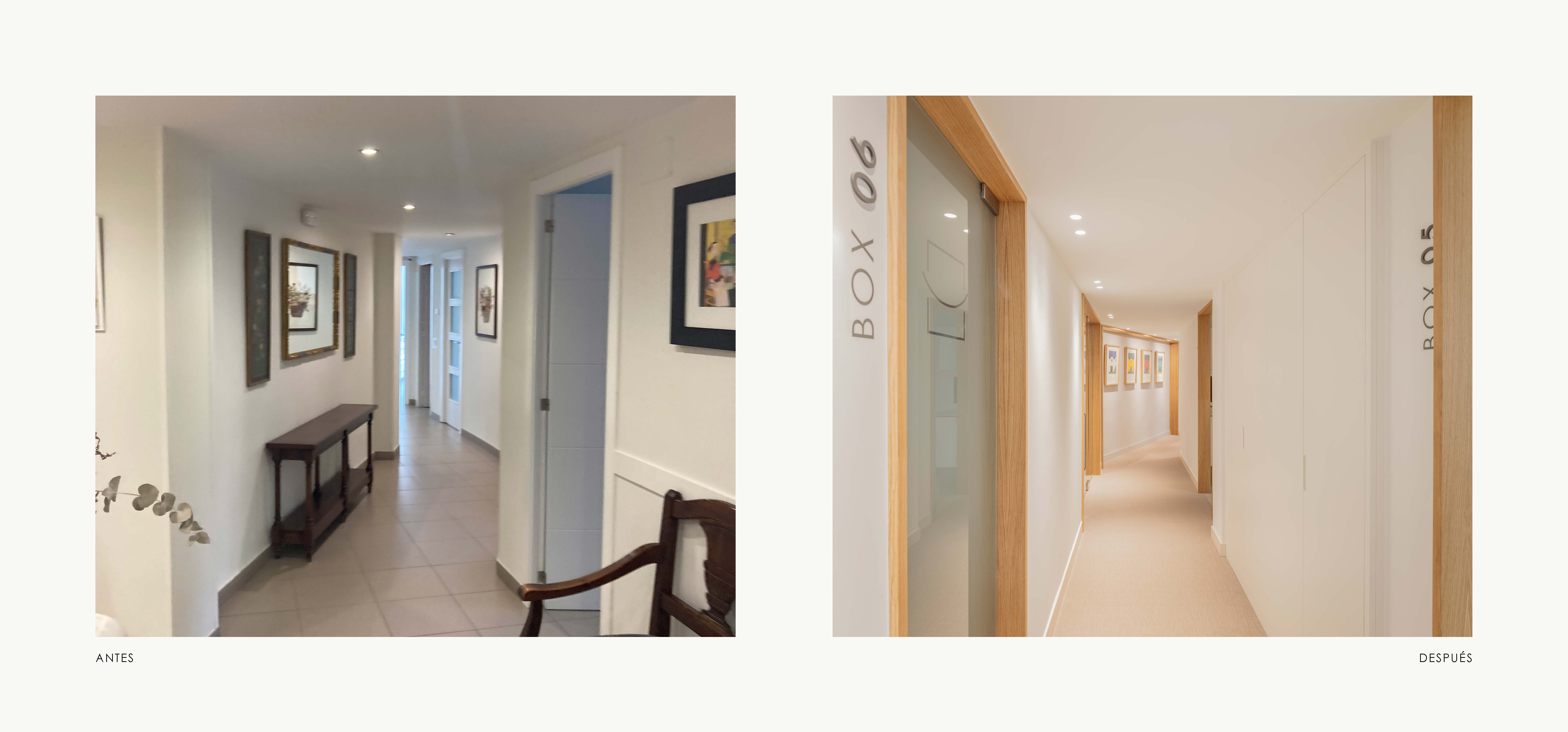 En esta clínica la nueva entrada desde planta baja, se concibe como un espacio luminoso y sereno, donde cada decisión busca mejorar la percepción y el recorrido. El núcleo del ascensor se integra mediante planos en espejo que amplifican visualmente el espacio y multiplican la luz. Frente a él, la recepción se diseña íntegramente en madera, aportando calidez y equilibrio al conjunto. La escalera, también revestida en madera, se plantea como un elemento protagonista y continuo, reforzando la verticalidad del espacio y guiando el recorrido de forma natural. Una paleta neutra, materiales nobles y una iluminación cuidada construyen una primera impresión acogedora, clara y alejada de la estética de una clínica convencional.