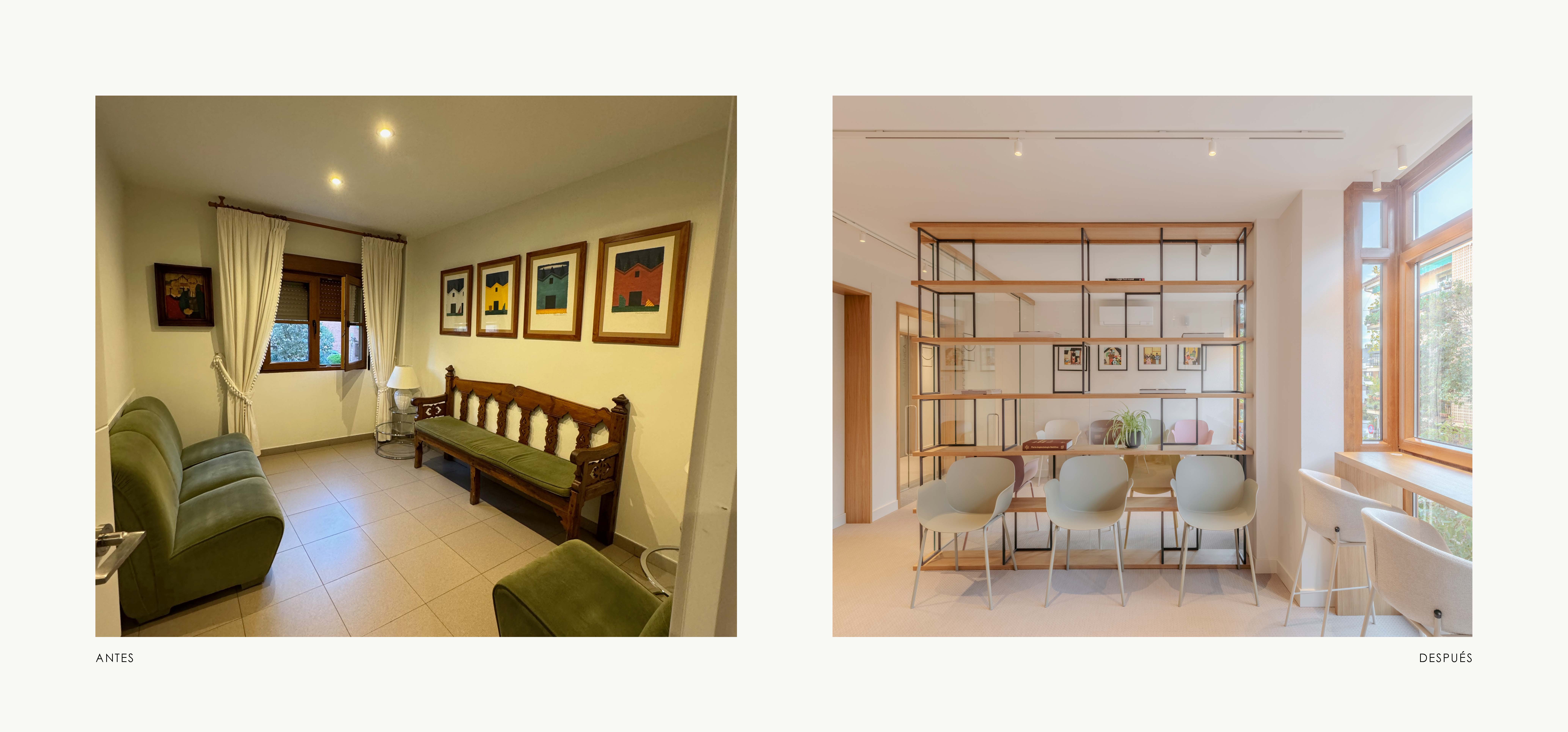 Ya en la planta primera, la sala de espera de adultos e infantil comparten el mismo lenguaje arquitectónico y se dividen de forma sutil mediante una estantería ligera, de madera y acero, que organiza el espacio sin perder la continuidad visual.