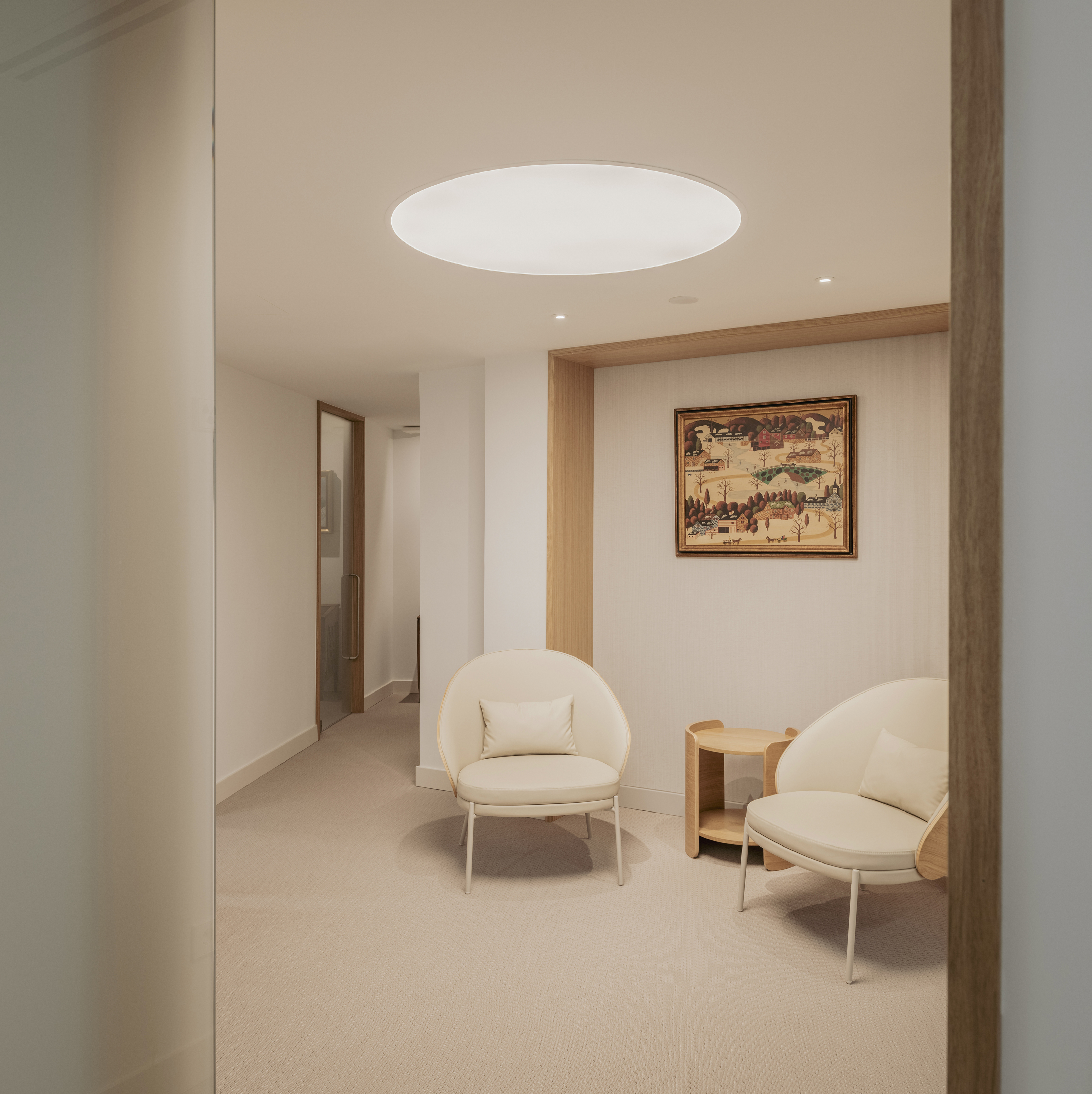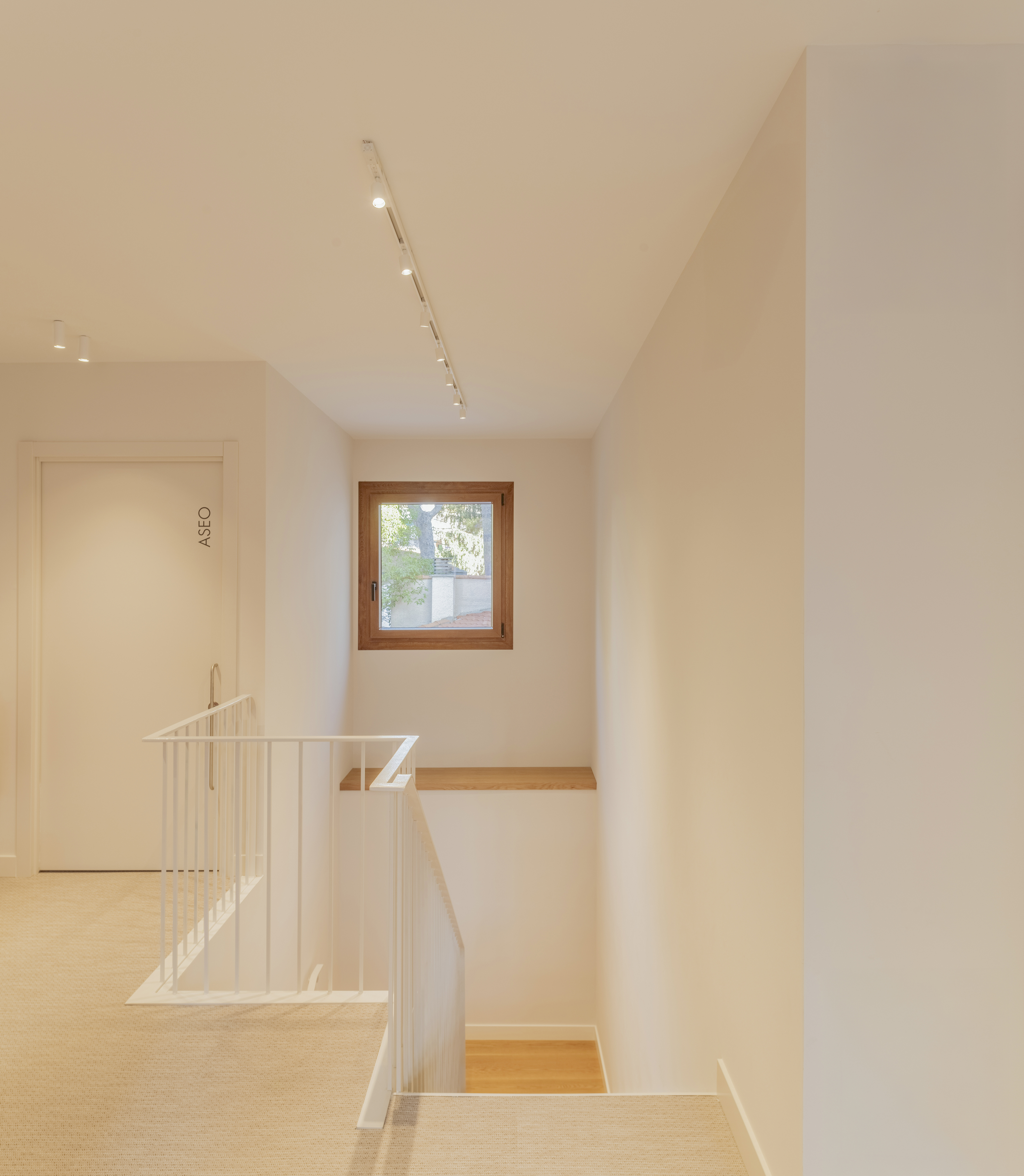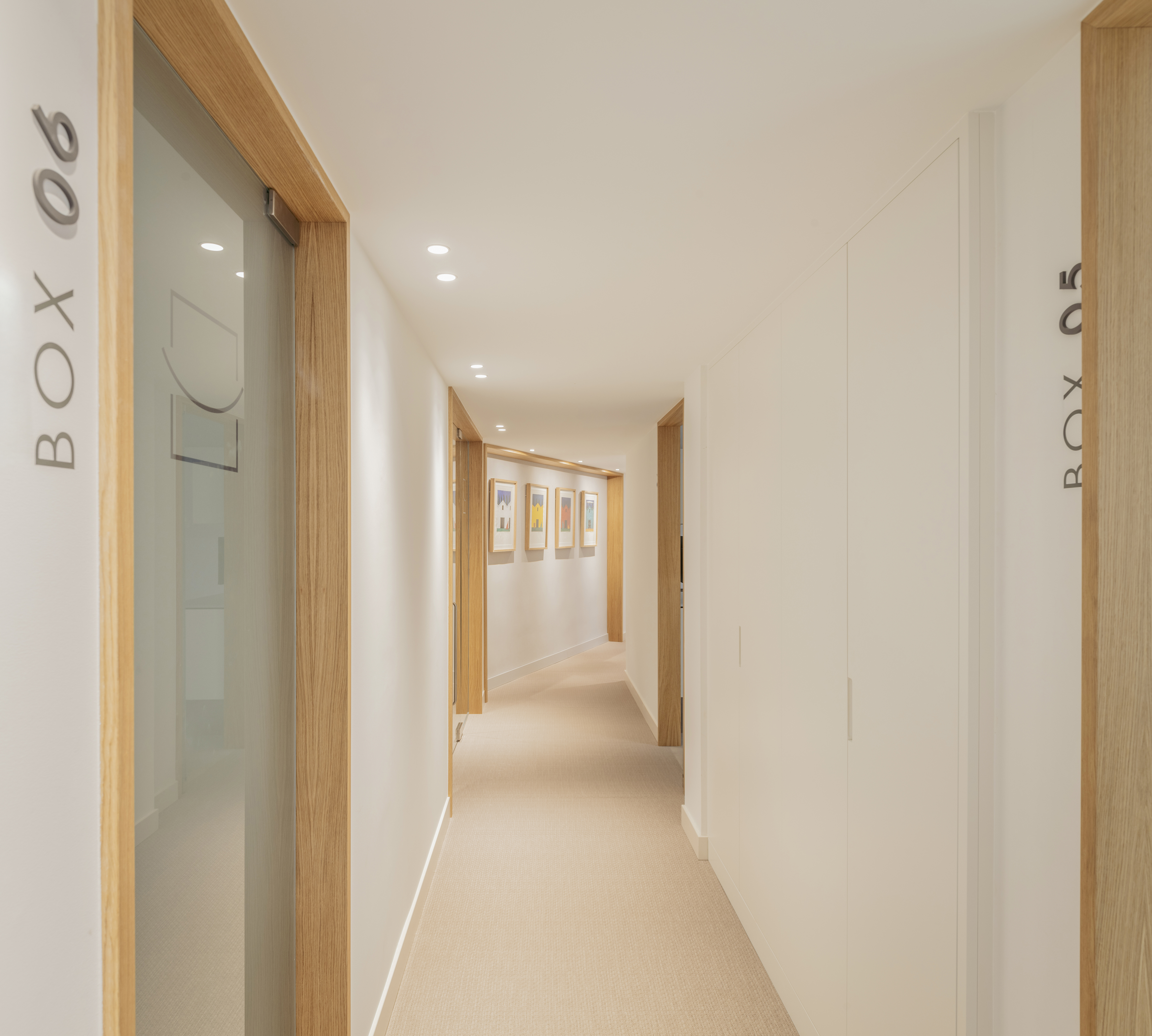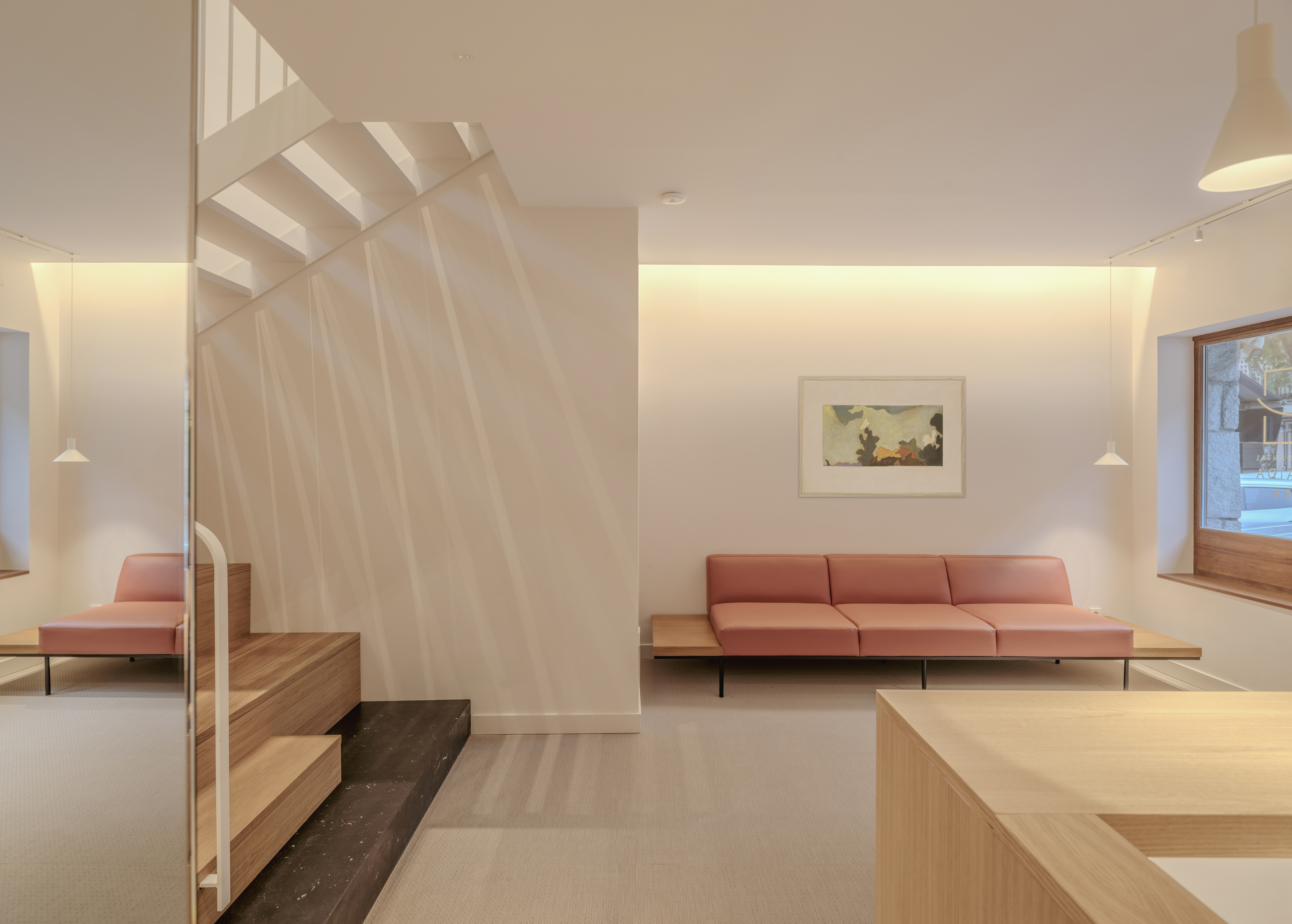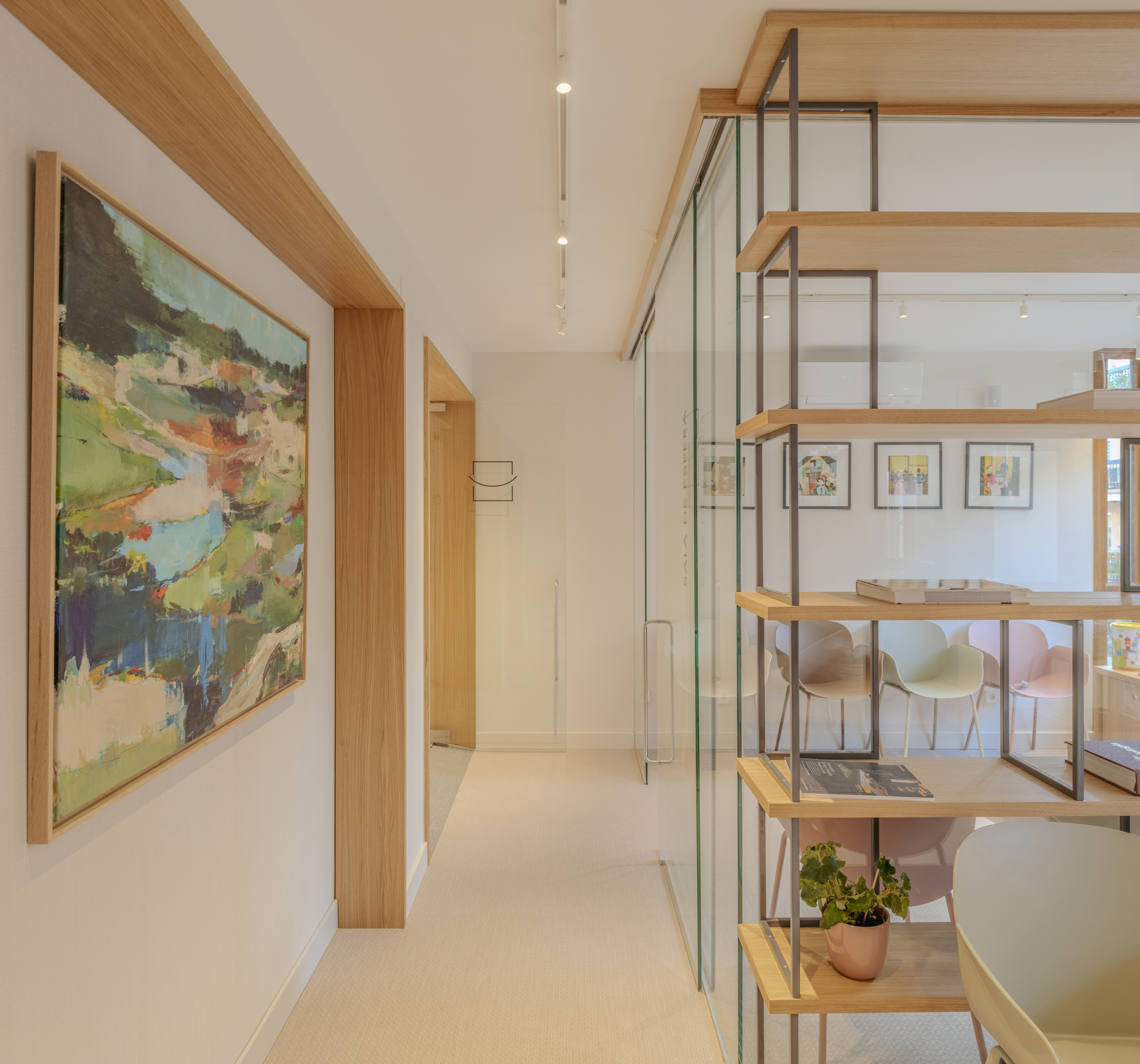 El pavimento continuo BOLON unifica el conjunto y aporta una sensación cálida y confortable, mientras que la madera natural, el arte integrado, los marcos de madera que se repiten como gesto arquitectónico aportando orden y continuidad y una paleta cromática suave de tonos neutros y cálidos, construyen una atmósfera serena y acogedora.