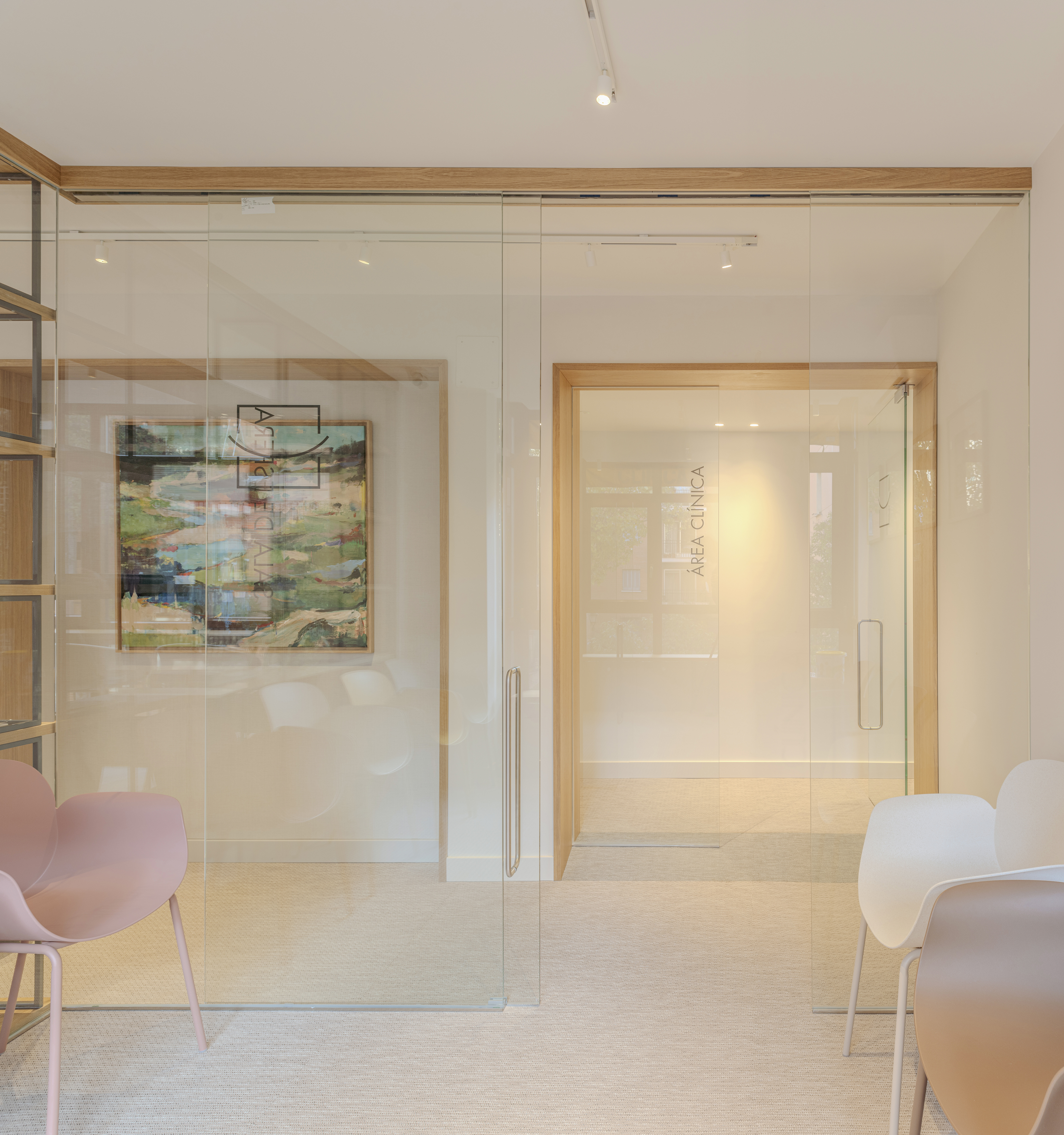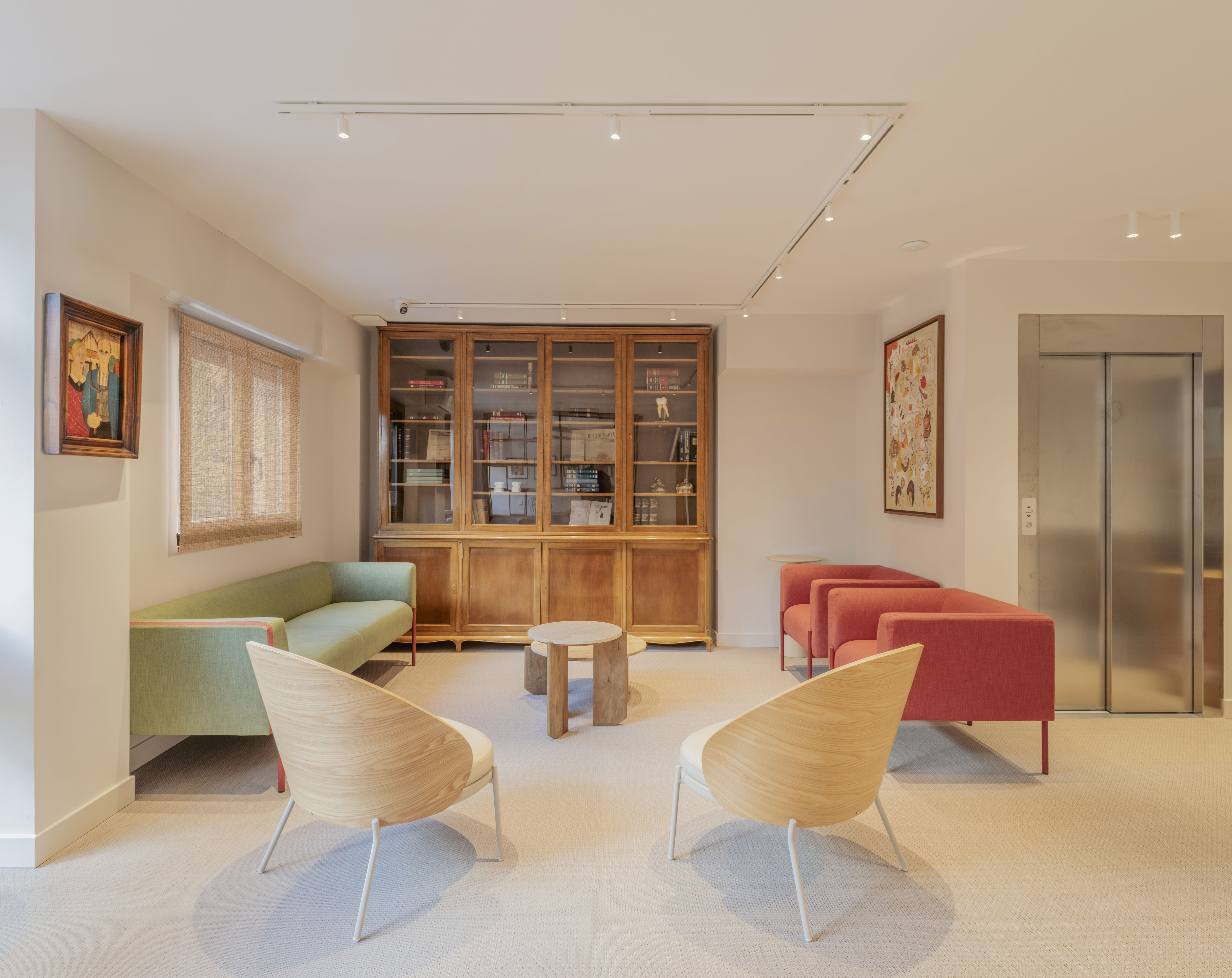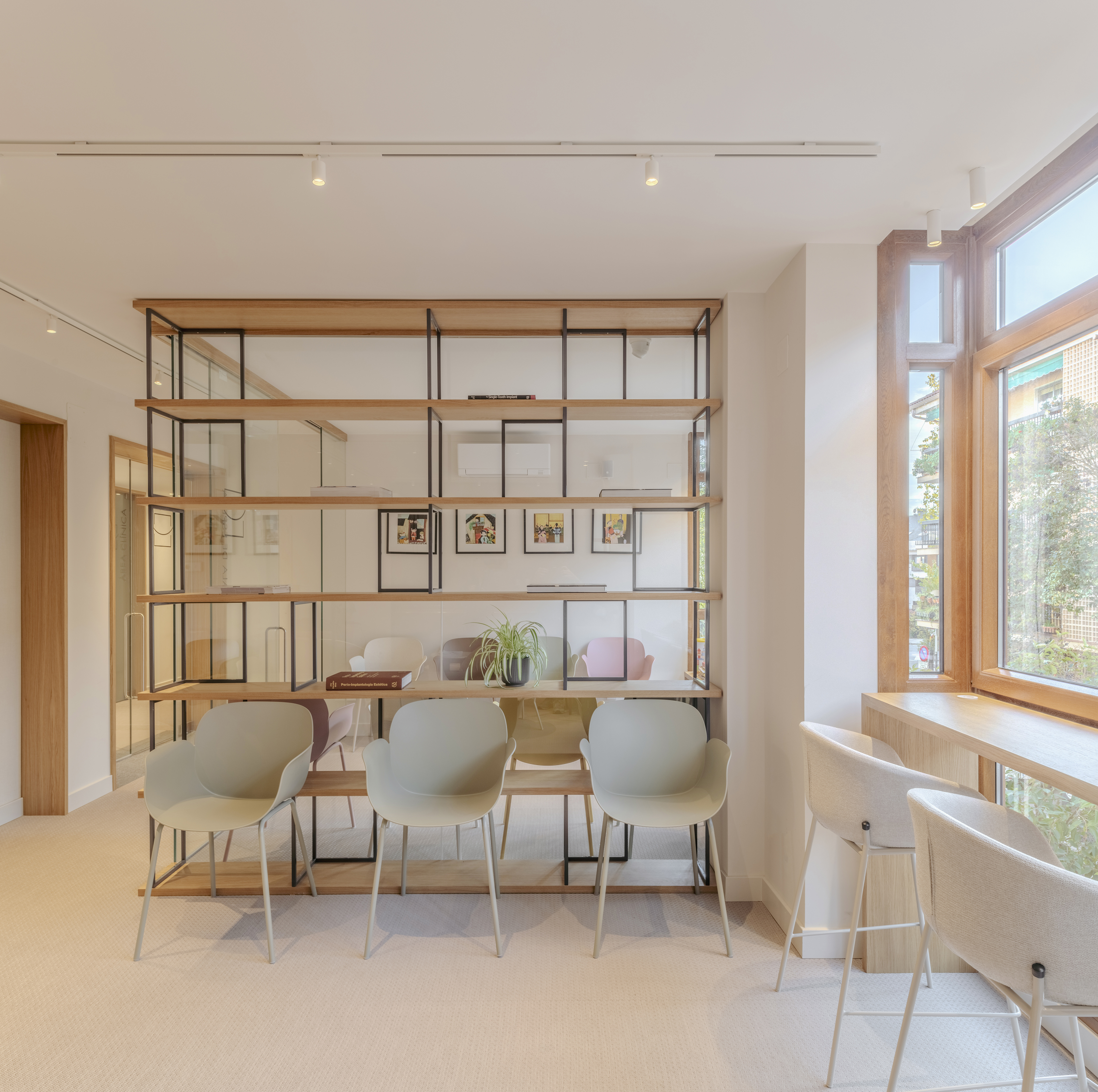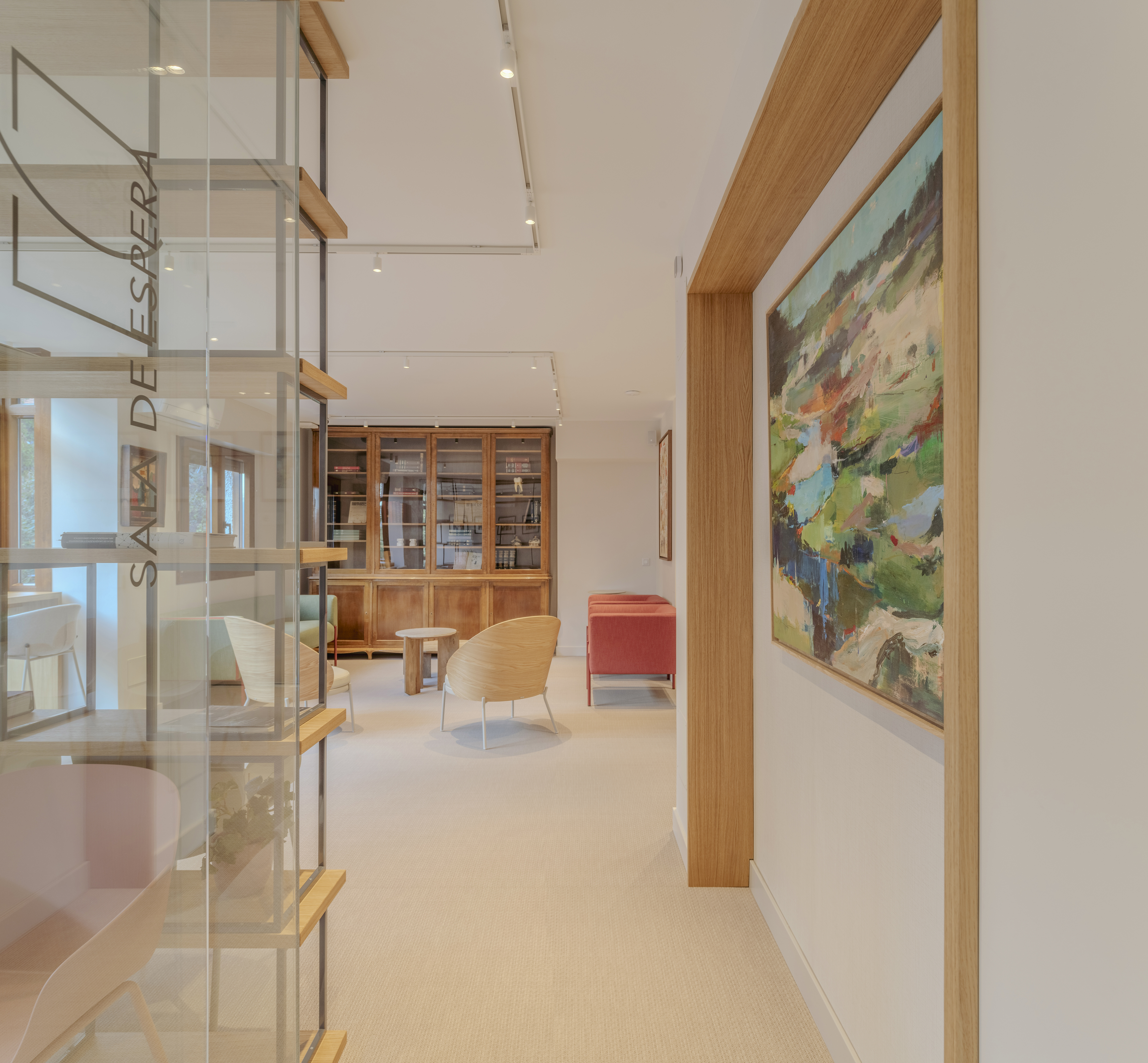 Ya en la planta primera, la sala de espera de adultos e infantil comparten el mismo lenguaje arquitectónico y se dividen de forma sutil mediante una estantería ligera, de madera y acero, que organiza el espacio sin perder la continuidad visual.