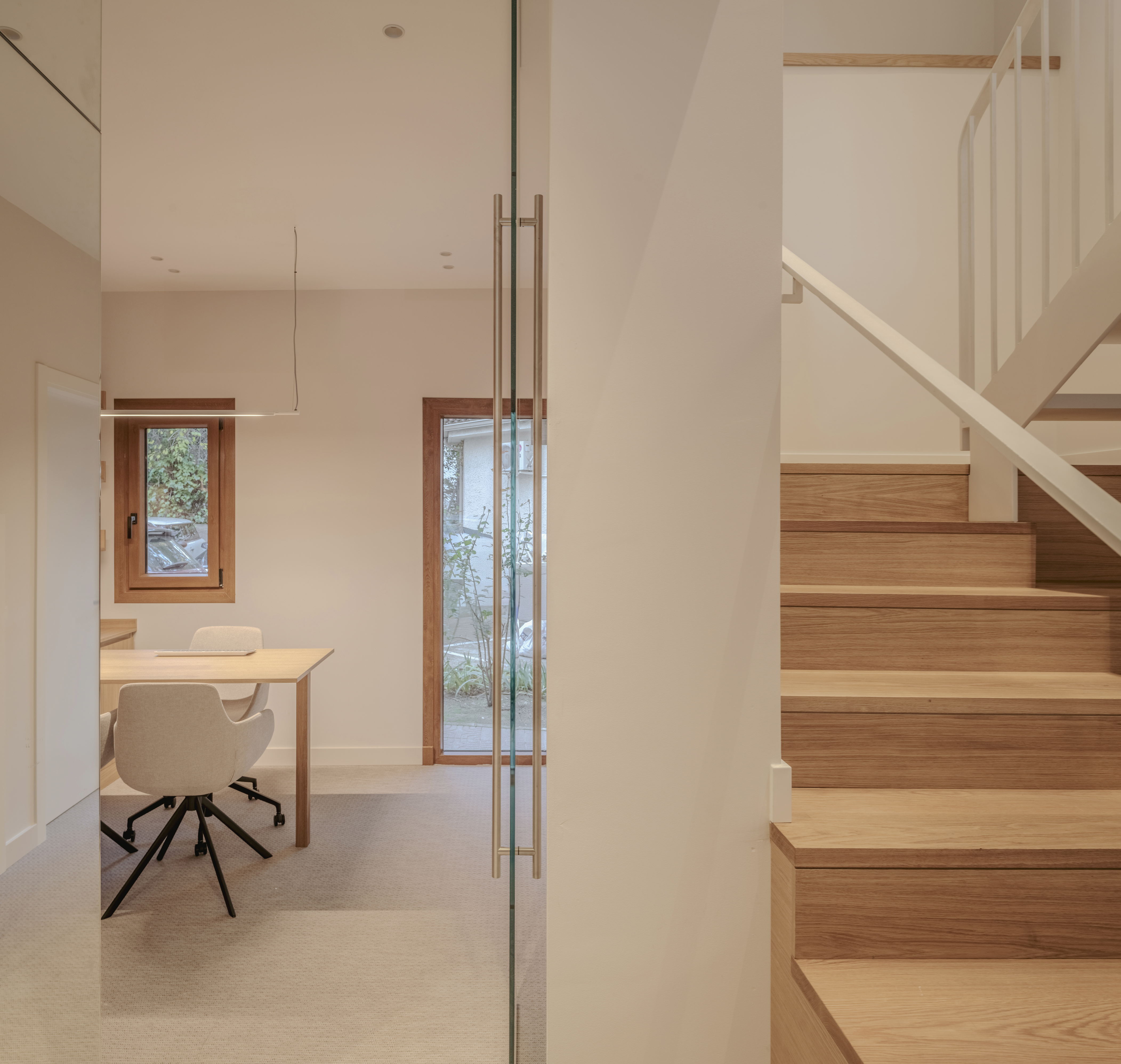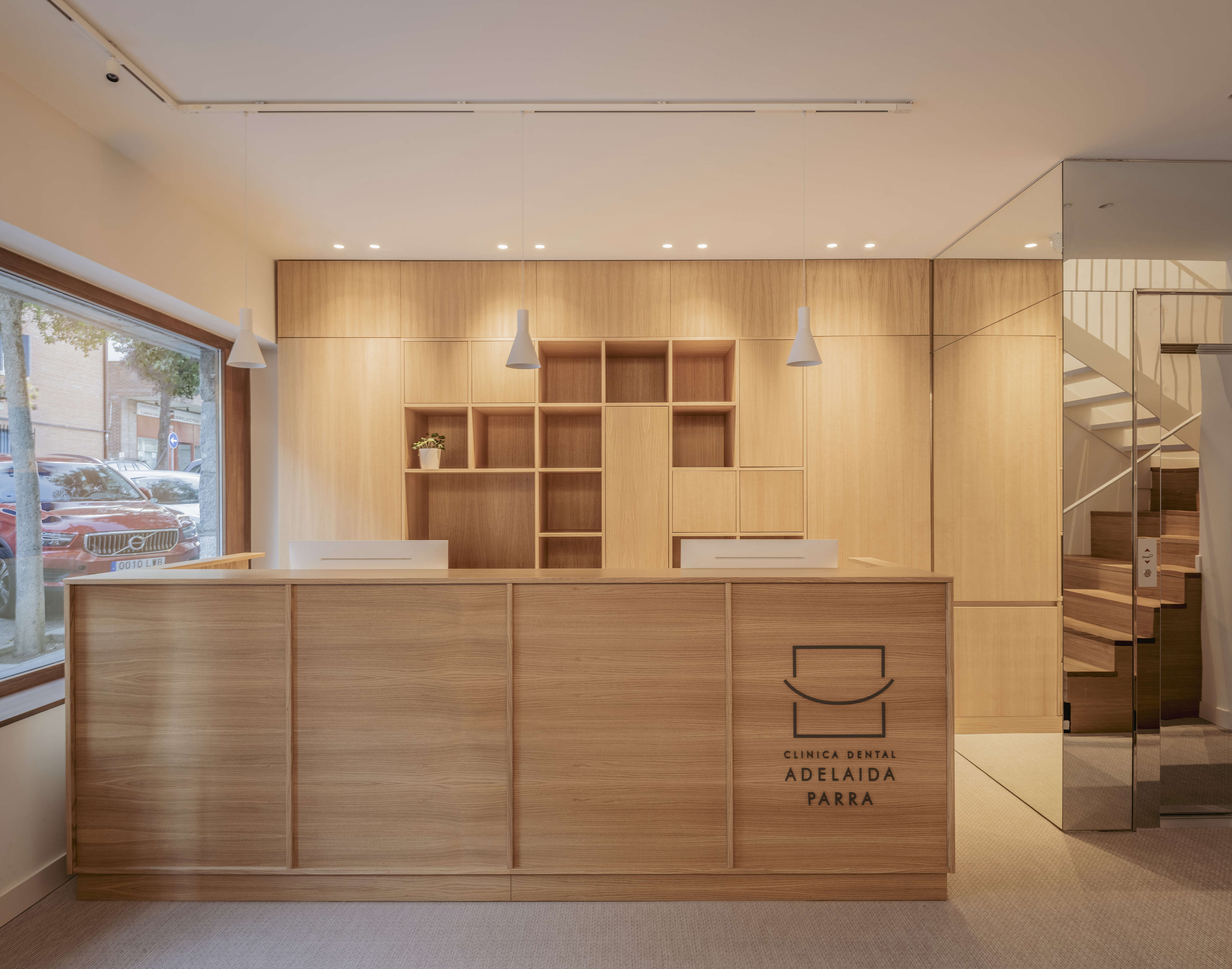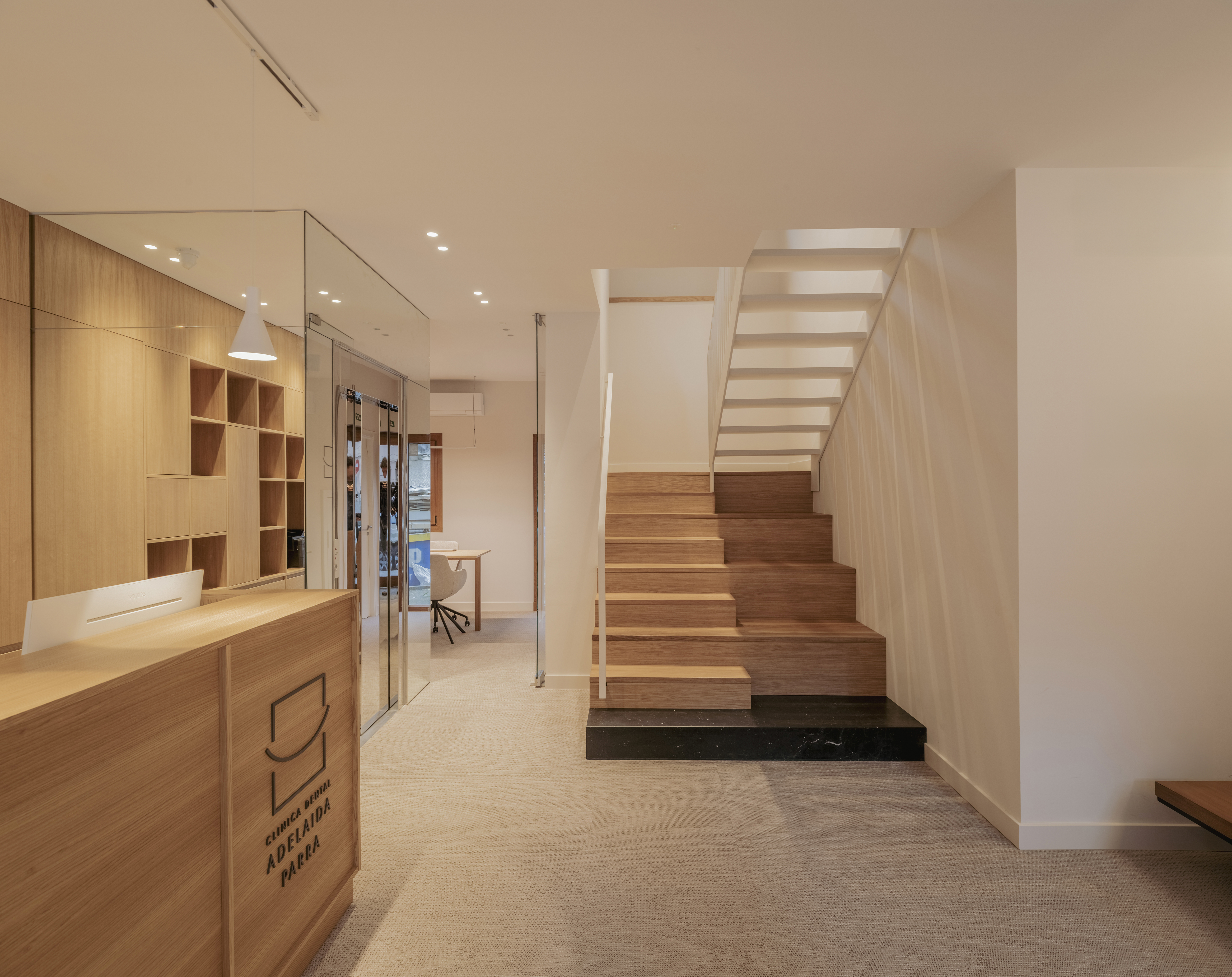En esta clínica la nueva entrada desde planta baja, se concibe como un espacio luminoso y sereno, donde cada decisión busca mejorar la percepción y el recorrido. El núcleo del ascensor se integra mediante planos en espejo que amplifican visualmente el espacio y multiplican la luz. Frente a él, la recepción se diseña íntegramente en madera, aportando calidez y equilibrio al conjunto. La escalera, también revestida en madera, se plantea como un elemento protagonista y continuo, reforzando la verticalidad del espacio y guiando el recorrido de forma natural. Una paleta neutra, materiales nobles y una iluminación cuidada construyen una primera impresión acogedora, clara y alejada de la estética de una clínica convencional.
